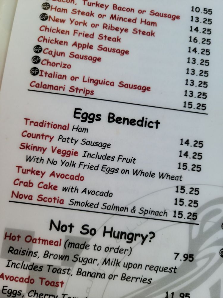 If you're seeking something lighter, the Avocado Toast and Oatmeal provide fresh, vibrant choices. The Eggs Benedict section is a standout, showcasing delicious variations from Veggie to Corned Beef Benedict, each drizzled with homemade hollandaise sauce.